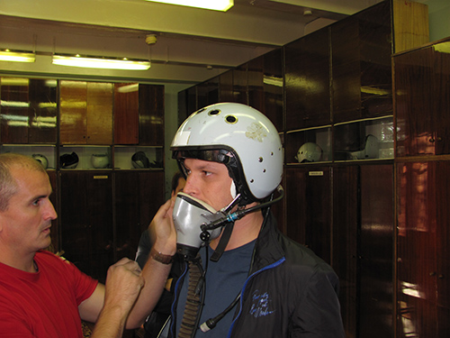 Dressing room, put on G-suits, Personal flight suit (if ordered), Helmet fittings, Oxygen mask testing & demonstration by the pilot on how to use them.