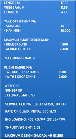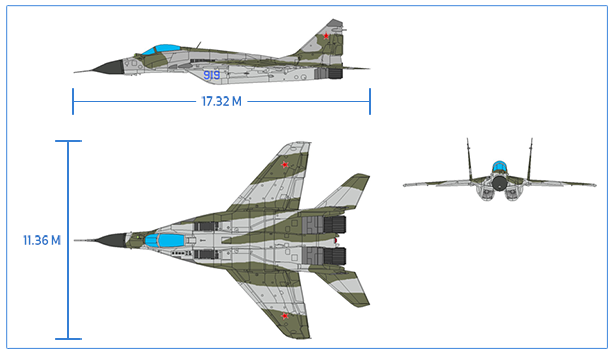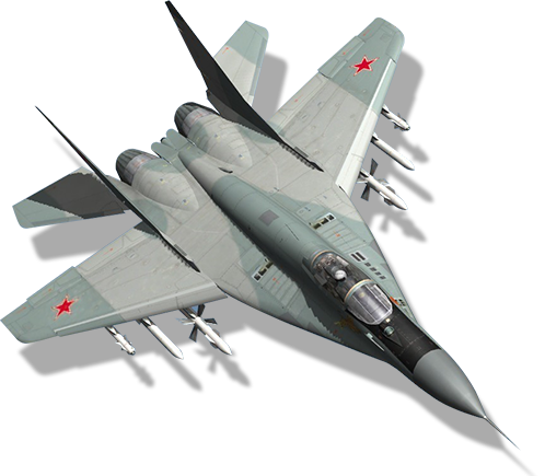 The Fulcrum, or MiG-29, is probably the most well-known fighter jet amongst military officers. It is one of the most advanced airplanes in the world, it has turbo-jet engines, possesses a superior ratio of power over mass (Thrust to Weight ratio) coupled with excellent aerodynamics, and a wonderful wide view from the cockpit. It is equipped with two RD-33 turbofan engines and it is the world's first aircraft fitted with dual-mode air intakes. These entire characteristics make the aircraft the most effective in any aerial combat. The basic version of the MiG-29 aircraft is made for destroying attacks using missiles and built-in guns against all types of air targets in fair and adverse weather conditions, in look-up and look-down situations, including jamming conditions. The MiG-29 is about the same in size as the American F-16 and F/A-18 fighters and they share similar combat specifications.